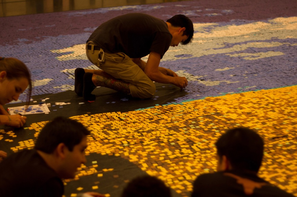 Once we had the final image, we decided on the 10 colors of construction paper that best matched the original image’s look, and then I wrote a python program using the image module to programatically create a key that could be printed and used to construct the mosaic in 133 “frames” of approximately 49 by 17 squares. Below is the final key breakdown that we used. The key letters were chosen for the distinctness of the character, as one printed frame would contain 779 characters representing that square’s color breakdown.