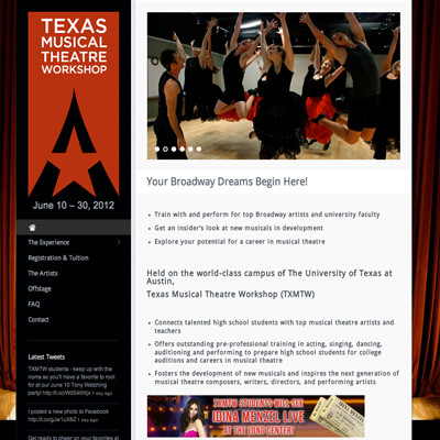 The Texas Musical Theatre Workshop (TXMTW) is a summer musical theatre intensive for high school students and a writing retreat for composers and playwrights of new musicals. Started in 2012, I have built TXMTW’s digital presence from the ground up, including their social media channels (Facebook, Twitter, Youtube), email marketing campaigns, and online application process.